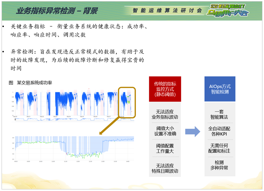 相比之下,借助AIOps智能算法全自动适配大规模业务指标、无需人工标注和干预、自动检测多种异常的方式,能够给业务可用性监控带来巨大裨益。