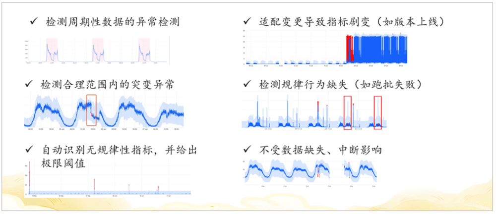 业务指标异常检测使用特征描述器接入数据,判断数据是否具有周期性、趋势性、抖动程度等特征,根据这些特征自动选择算法或者算法组合进行异常检测。检测结果可以识别多种规律,比如一些周期性强、有规律的数据,业务指标异常检测能够适配版本上线、变更导致的指标剧变,检测合理范围内的突变异常,检测规律行为缺失,自动识别无规律性指标并给出极限阈值,不受数据缺失、中断的影响。