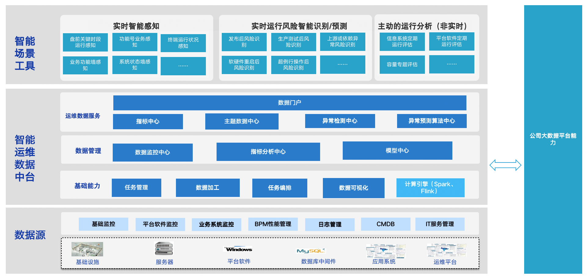 必示科技助力广发证券运维数据中台体系从整体架构上分智能场景工具层、运维服务层、中台能力层三层建设,构建一体化的数据“采、存、算、管、用”能力。