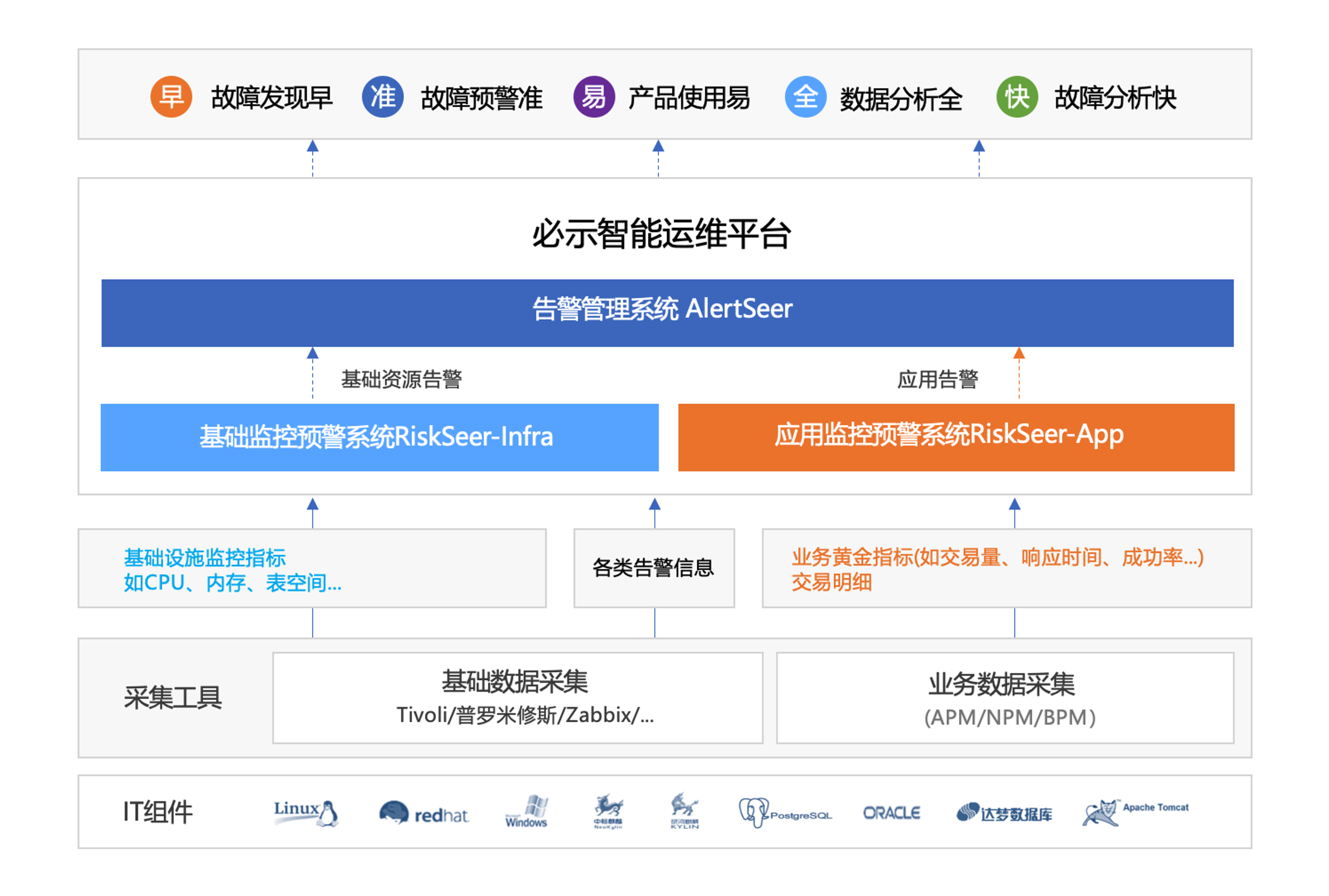 项目成果应用于必示智能运维平台,基于AIOps算法和大数据技术,针对各类性能指标数据和告警数据进行智能化分析。一方面构建应用监控预警和基础风险预警体系,实现从业务到基础设施的一体化异常检测、故障排查与运行风险感知能力,帮助用户及时准确的发现系统运行异常、主动消除潜在风险,持续提升业务运行健康状态;另一方面构建标准化告警管理体系,实现告警数据全生命周期管控,同时提供告警摘要和告警治理等智能化告警分析手段,辅助运维人员快速处理告警,提升企业IT运维管理效率。