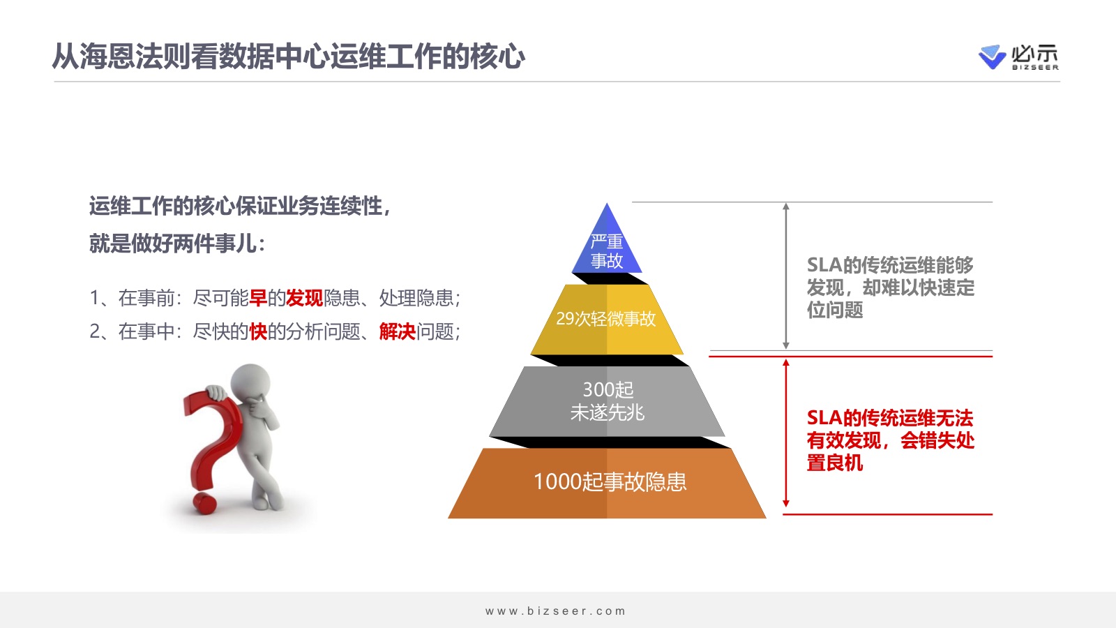 大家对海恩法则比较了解,在现有挑战的情况下,要做好业务连续性,仅仅做应用性能监控是不够的。因为传统的业务性能往往基于SLA进行监控,当告警发生的时候,往往故障已经产生了。