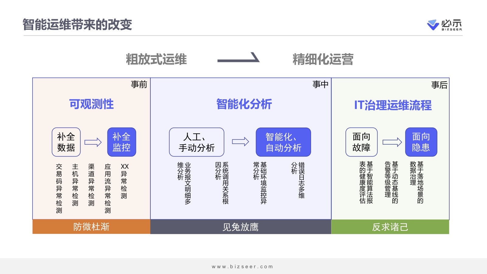 必示应用性能AIOps解决方案能够帮助数据中心从粗放式运维迈向精细化运营,从事中、事前、事后三个角度来具体看一下。