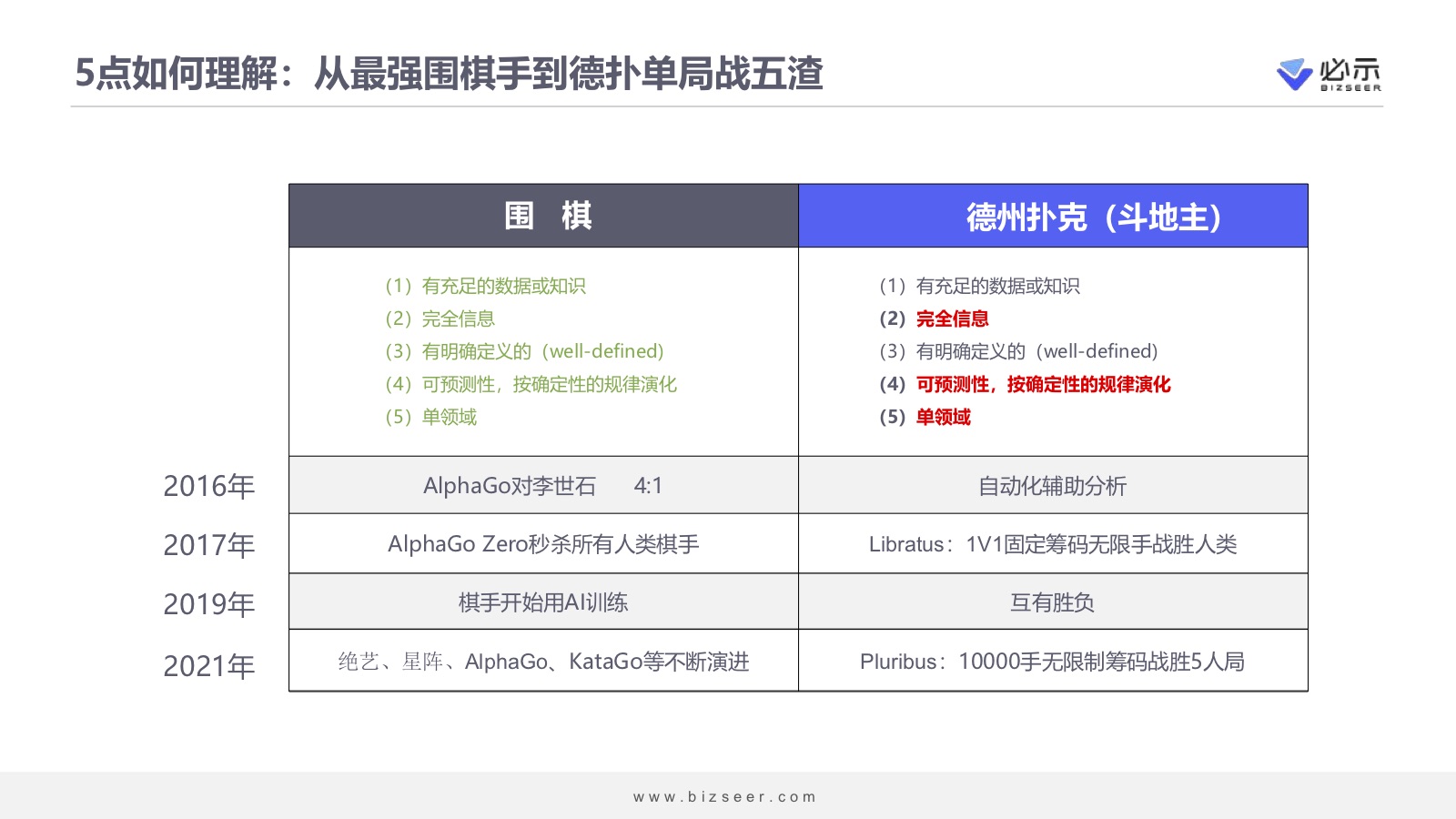 从上面提到的5个条件来说,围棋是完全满足的,它是单领域、信息完全的。AI下围棋的时候,只需要看棋盘上的黑子、白子以及规则,至于下棋的人是谁不重要。德州扑克不同,要不要牌、加不加筹码完全取决于自己与对方手中牌的好坏,这是AI做不到的,也就是说“信息不完全”。然后,德州扑克的不可预测性很强,比如我的牌面虽然不好,可以不下筹码或者干脆all in 来迷惑对方,这也是人工智能很难做到的。