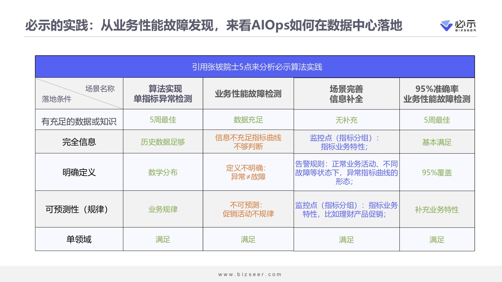 以此来看必示的算法实践。大概2017年的时候,必示自研的单指标异常检测算法,完全满足5个条件,能够很好地找出违反历史规律的异常点,但是它没有上生产环境。原因在于,单指标异常检测不是生产环境所需,生产环境需要的是业务系统的故障处置。