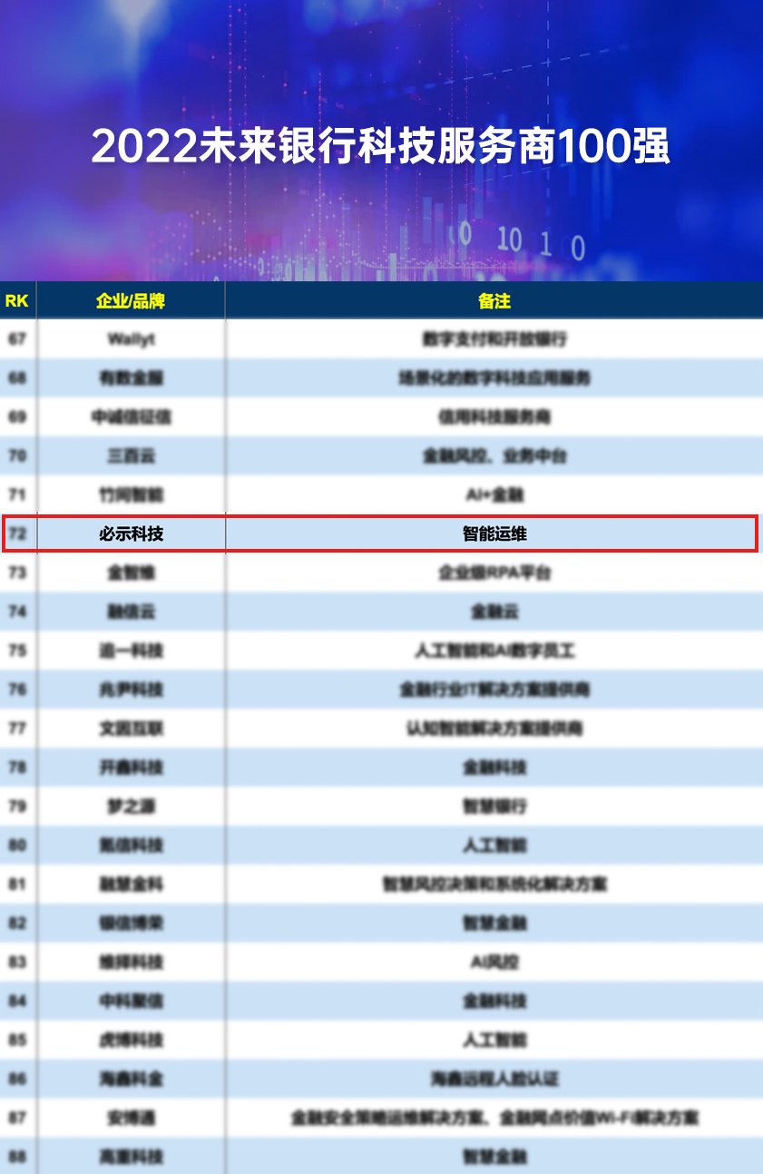 近日,互联网周刊、eNet研究院、德本咨询联合发布了2022“未来银行科技服务商Top100”榜单,必示科技凭借领先的产品技术、行业应用案例以及优质用户口碑入榜。入围本次银行科技服务商100强榜单的还有神州信息、蚂蚁集团、建信金科等服务金融行业的科技公司。