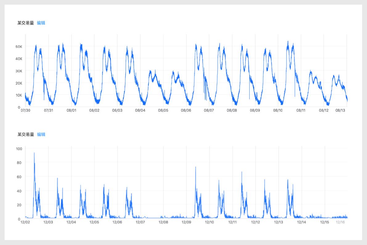 例如,下图即为不同业务的交易量指标,呈现出很强的周期性,而根据实际业务情况的不同,二者形态上会有一些区别。