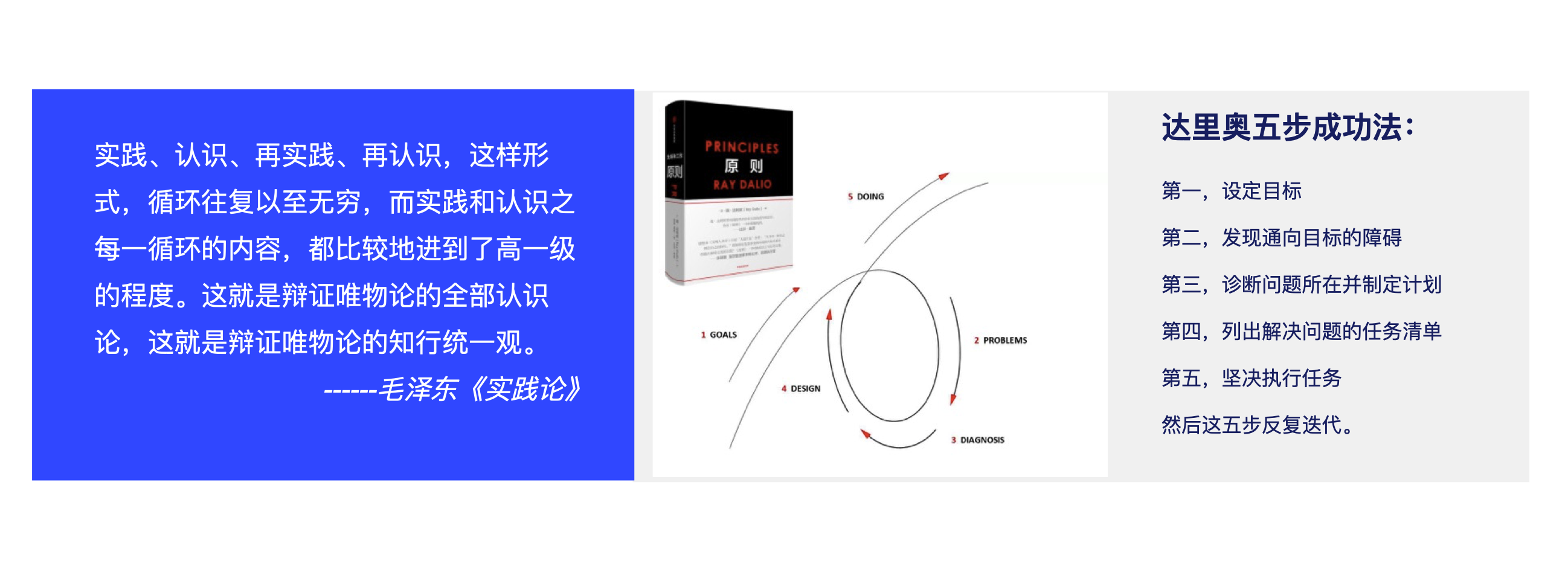 看起来困难重重,但具体实施中也是有成熟的方法支撑解决的。根据毛泽东《实践论》和达里奥“五步成功法”,在以“效果”为导向的智能运维系统的落地实施中,需要多方协作、不断迭代。