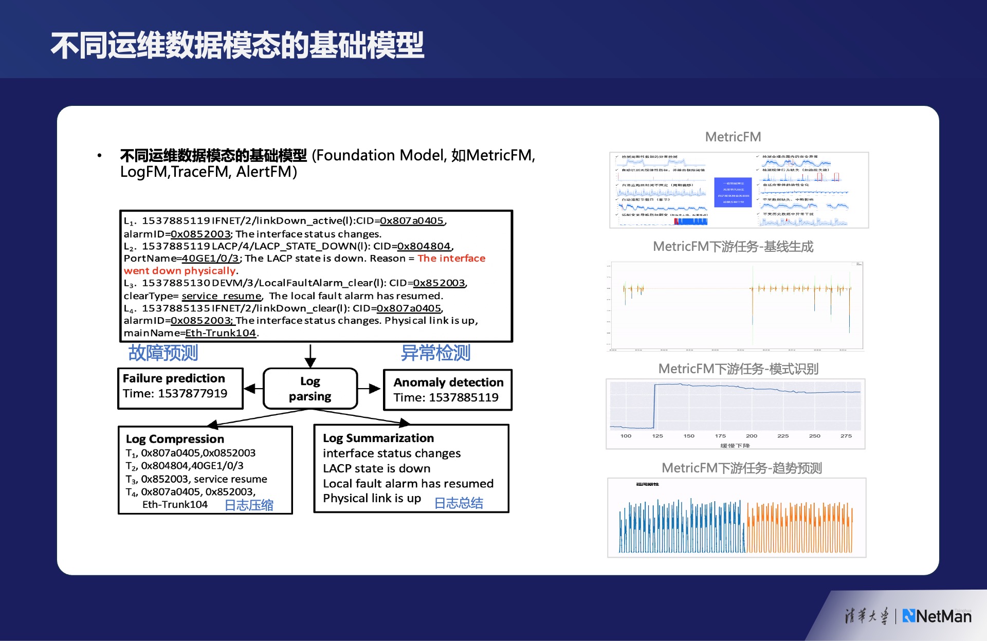 过去我们用小模型的方式,每一个都是单独做模型,然后评估准确率。本质上需要对底层类型的数据有深刻理解的能力,在这之上建立基础模型,而这些任务就是基础模型的一个个小模型的应用。对于日志、trace数据、告警数据、其他数据也都是类似的情况。多模态的数据每一个都有自己强烈的特点,基于这些特点建立的基础模型(Foundation Model),然后对它的上游应用再建立模型,这种思路对AIOps智能运维方向也是一个不错的启示。