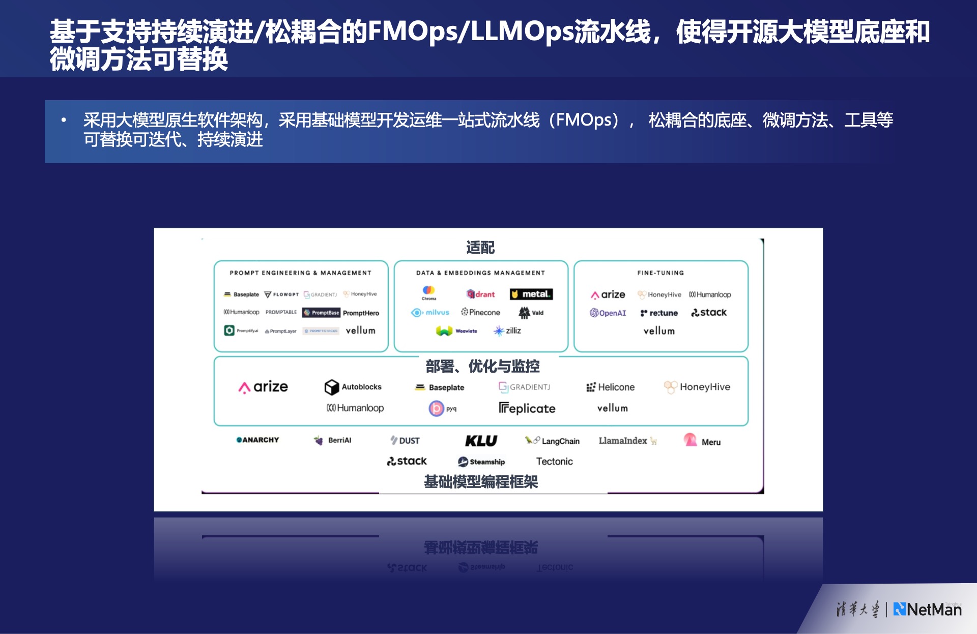 同时,我们都非常担心被某个模型或方法所束缚。上图展示了大语言模型的基本框架,包括适配、部署、优化和监控,以及基础模型的编程框架。类似于DevOps的流水线一样,我们尽量使每个部分都可替换和松耦合,这样在某个组件更新时可以直接替换。底座、微调方法、各种工具等都力求可替换,以便在工具演进过程中能更好地利用开源社区的最新成果。