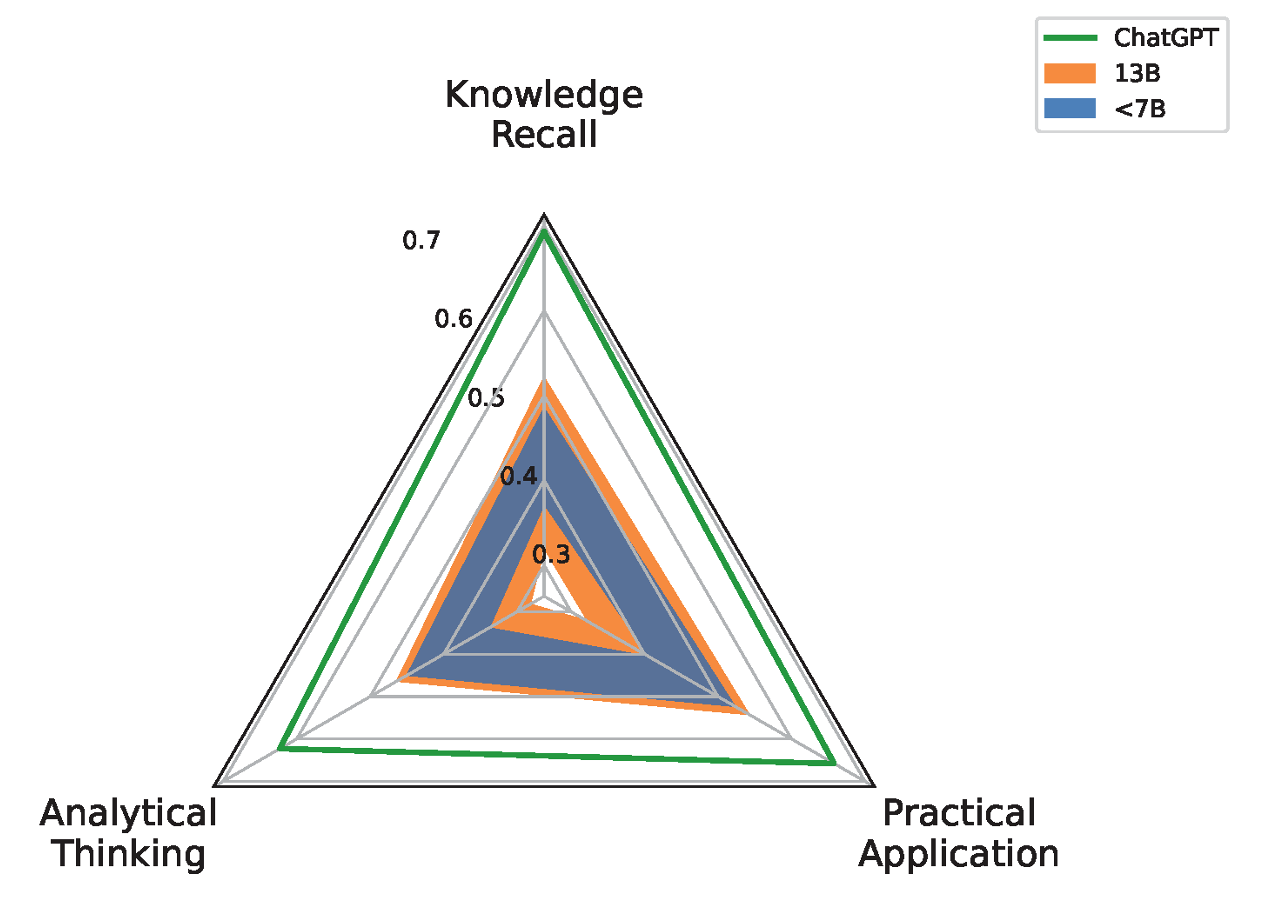 较小的模型,如LLaMA-2-7b-chat和Internlm-chat-7b,在客观的问答任务中表现出有竞争力的性能,接近具有13B参数的模型的能力,这归功于它们的微调过程和训练数据的质量。