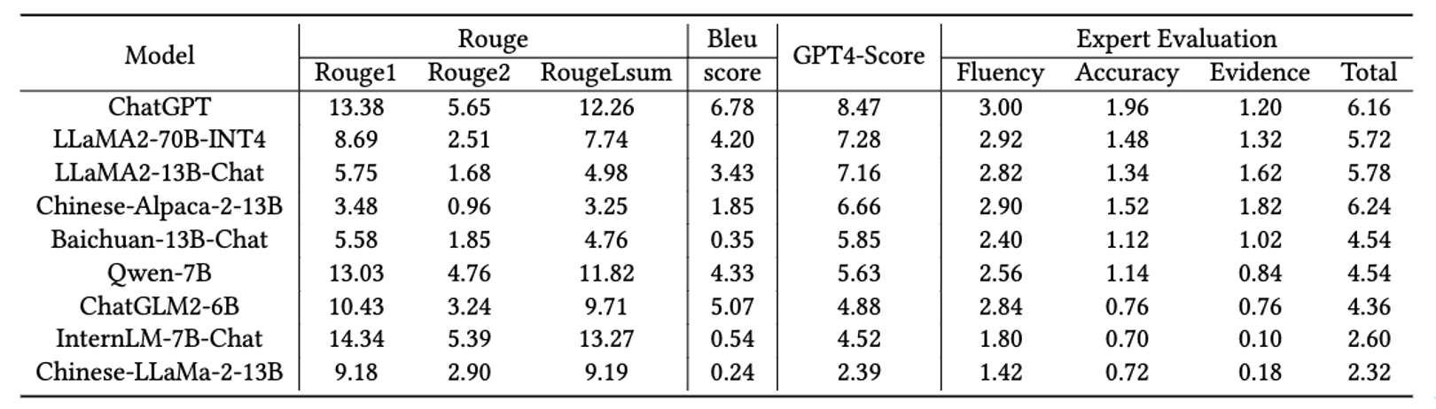 我们评估了十余种主流大模型,我们的发现揭示了传统的BLEU指标不适合用于专业领域的知识型问答评估,而GPT-4得分可以作为人类评估指标的最佳替代品。最后,我们探讨了不同模型量化方法对总体性能的影响。