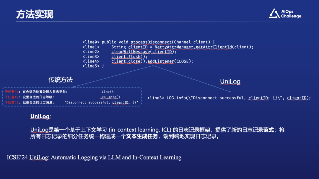 尽管这么多年来的研究取得了一些进展,但过去的研究仍存在一定的局限性。大多数研究工作会将问题拆解为几个子任务来解决,每篇论文通常只关注一个子任务。如前述图例,研究者通常把日志语句生成任务划分为三个部分:首先是确定在哪一行添加日志,比如上图例子中是在第四行添加日志;其次是定义日志的级别,例如上图代码中“log”后面的级别是“info”;最后是决定记录哪些详细信息,如上图所示的“disconnect”事件。然而,这些解决单一子任务的方法通常无法实用。当我们尝试将研究应用到产业界时,通常需要将这些不同的日志生成子任务结合起来构成一个完整的任务,并通过一个综合的日志生成解决方案来解决现实日志生成问题。