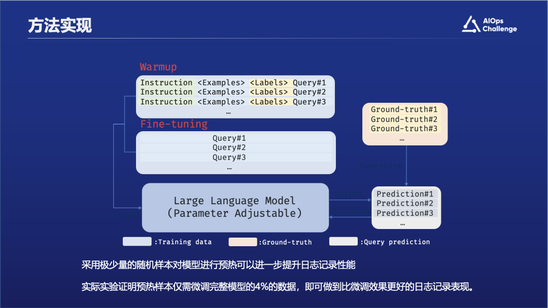 在处理完所有参考样例和他们的标签之后,UniLog将会把它们拼接在同样预处理好的目标代码段前,组装成一个完整的提示词。之后,UniLog将会提交提示词给大语言模型进行生成。生成的结果同样是如图片右上角所示的包含行号的日志语句。除了前面介绍的提示词相关的知识以外,我们还会用大模型做预热。