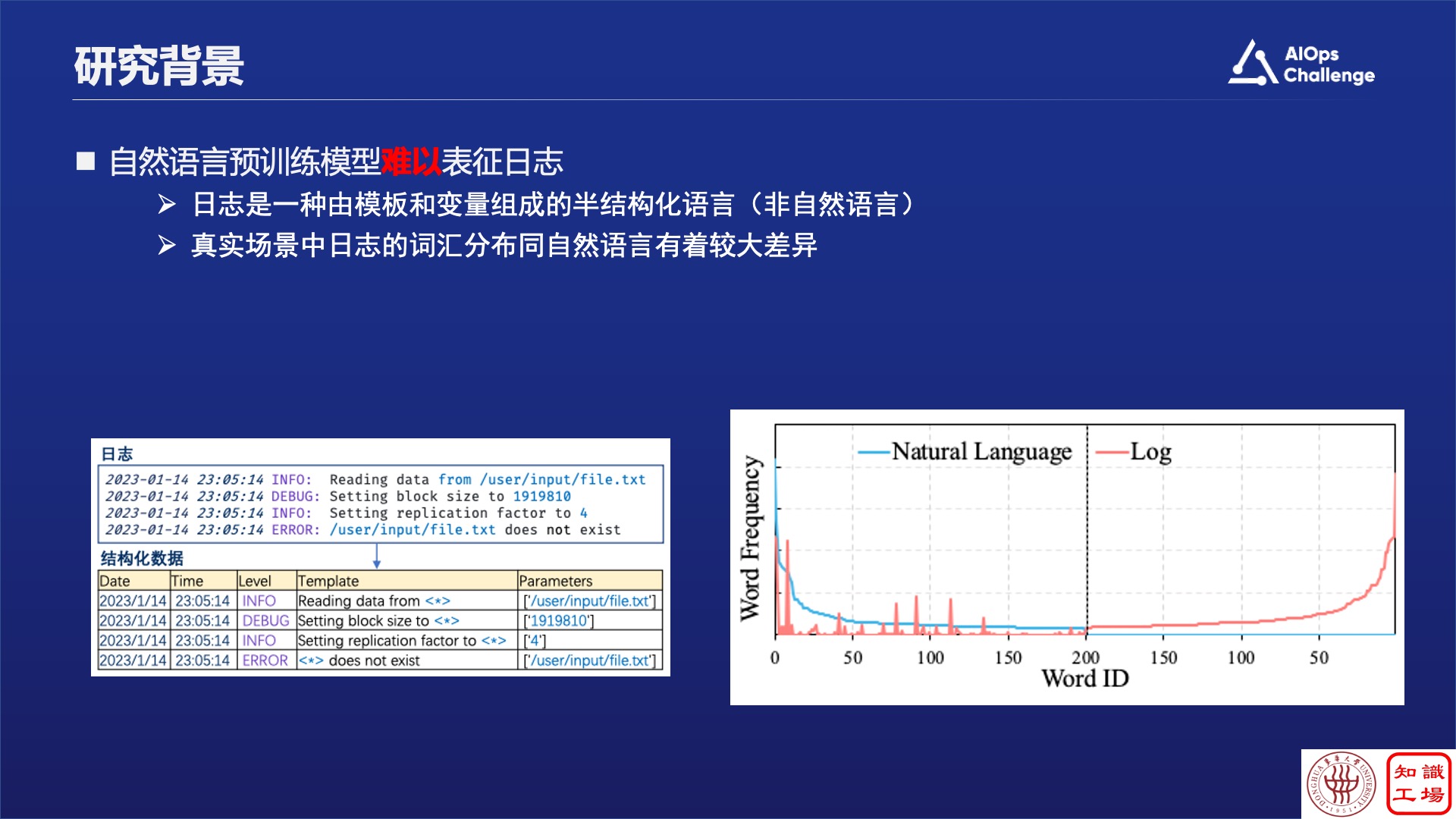我们把这种类似BERT的预训练语言模型放到日志里面去,发现其实它并不是很work,原因是什么?分析结论是,自然语言中的高频词和在日志中使用的高频词其实是不一样的。这里就会产生三个具体挑战: