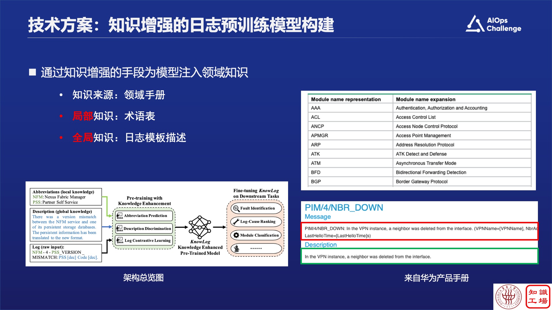如果局部知识不懂,就看缩略词表,把局部知识补全。如果是全局知识不懂,就看全局知识描述的文档。基于以上,我们提出了知识增强的日志预训练模型的框架,该框架主要分为三部分: