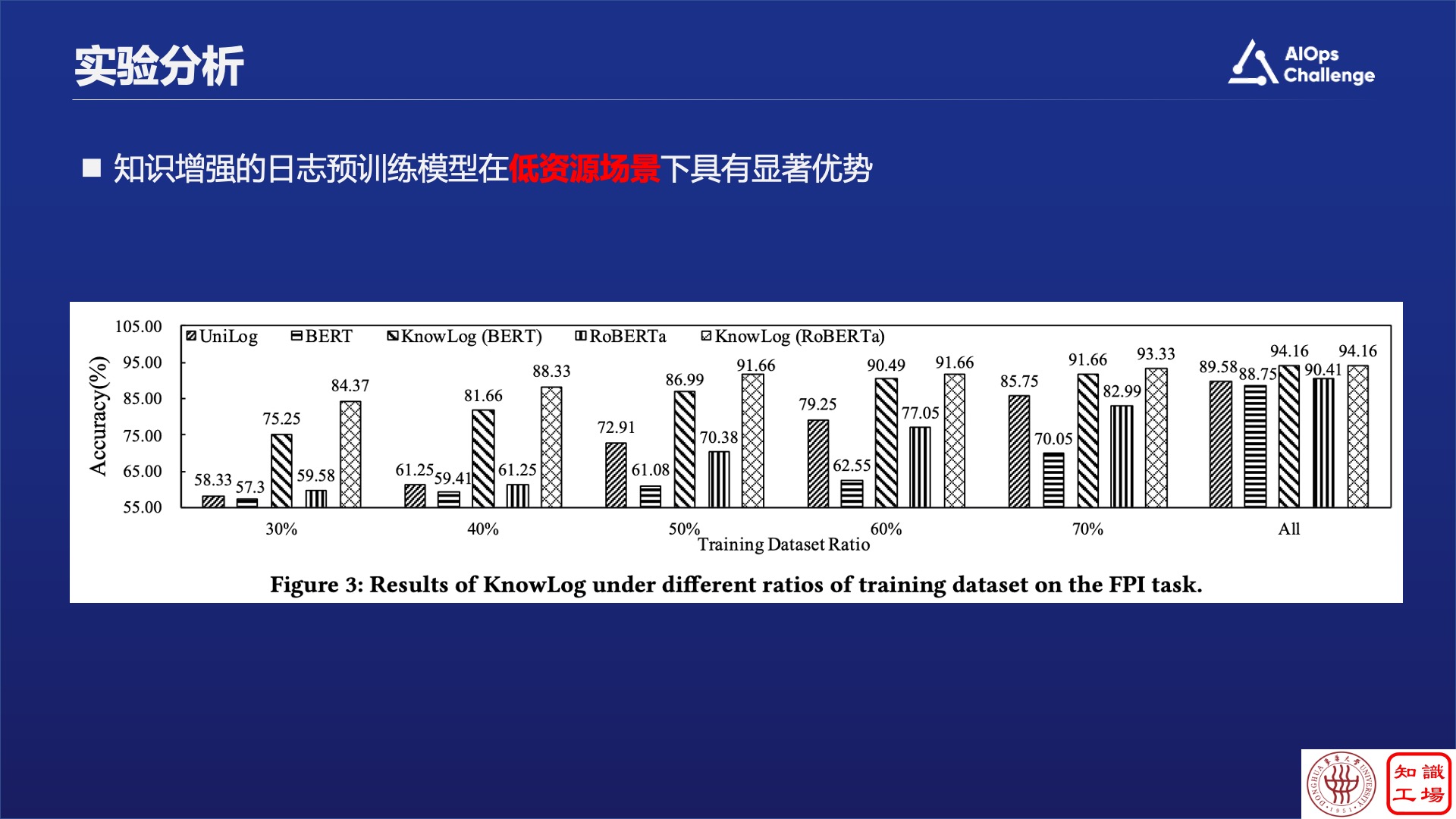 基于这个方法,我们构造了很多的实验,从华为、思科、华三等一些厂家提取日志模板。注意这里做了一个改进,就是我们没有去理解日志,而是去理解日志模板,因为日志很多,但是模板并不多。我们这边拿了10万条的日志模板,然后构造了一些下游任务,从而得到了几个结论: