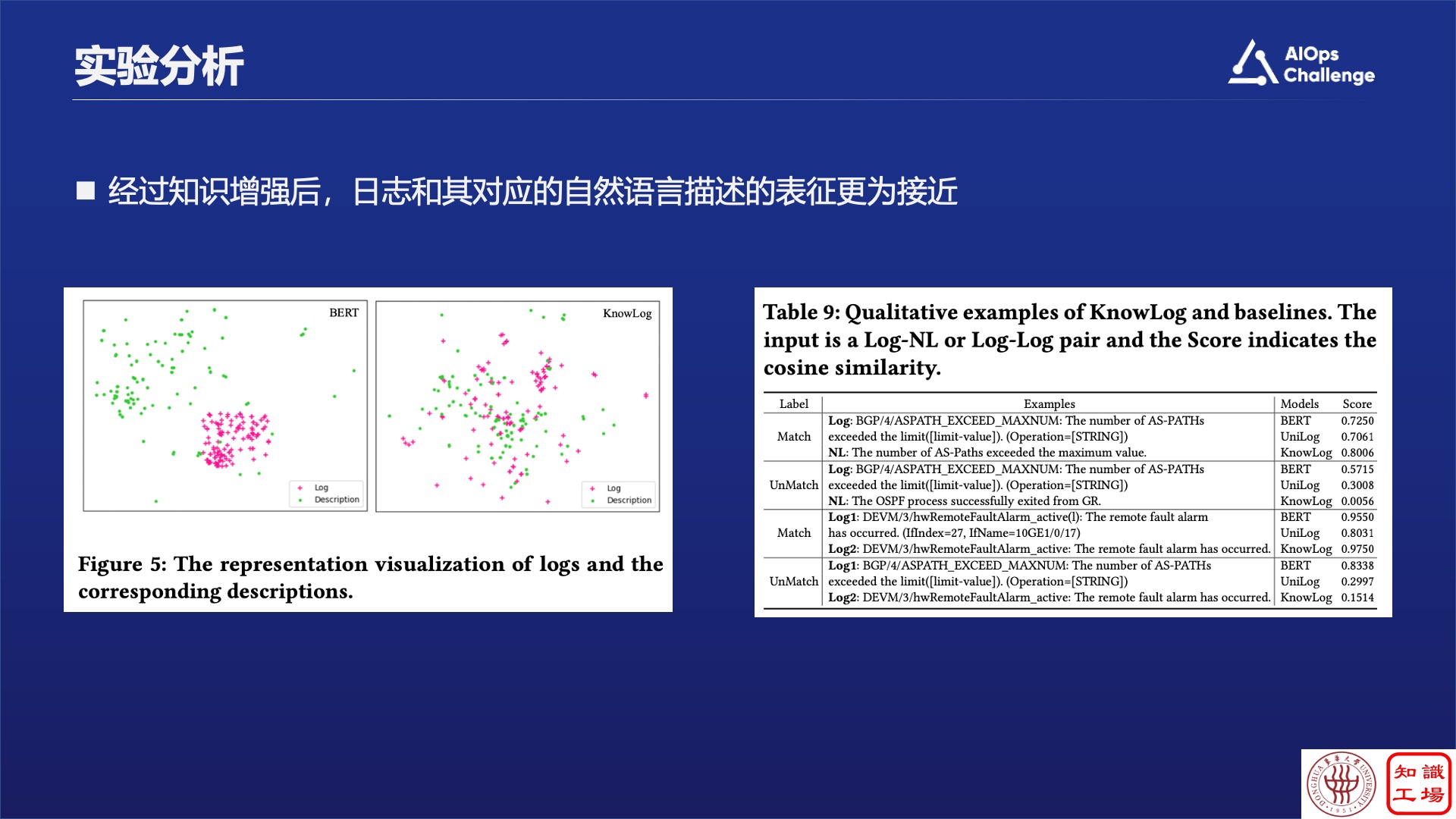 同时,通过可视化展开可以看到,在没有做知识增强之前,原始日志和它的描述其实是红点和绿点区分得非常开,但通过了我们的知识增强对齐之后,把日志和它的描述对应的比较紧密了。