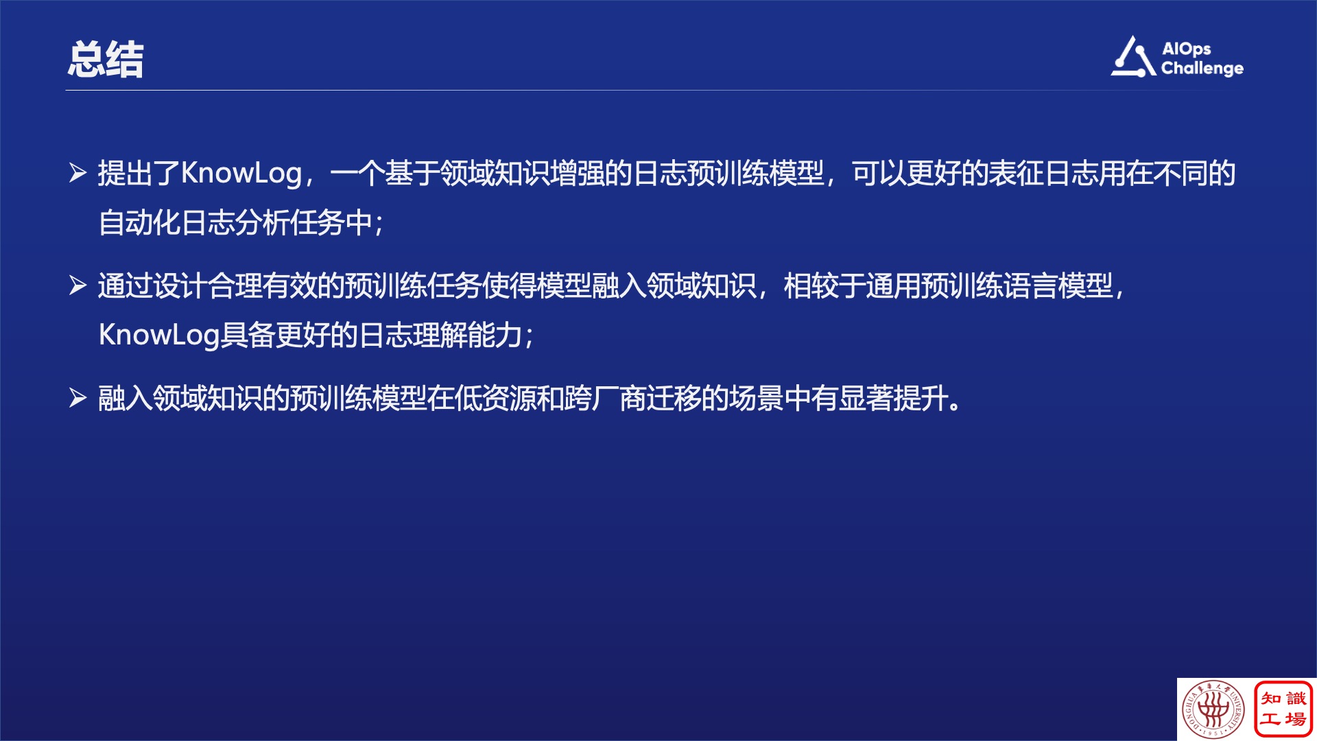 总结一下,我们事实上是提了一个基于领域知识增强的框架。目前这一版的缺陷就是必须先有文档,才能做日志理解。后续还有工作就是不需要有文档,直接用ChatGPT生成。通过实验我们发现用ChatGPT,只要精心设计提示词,规范好生成结果,它也是能达到跟日志文档一样甚至更好的效果。