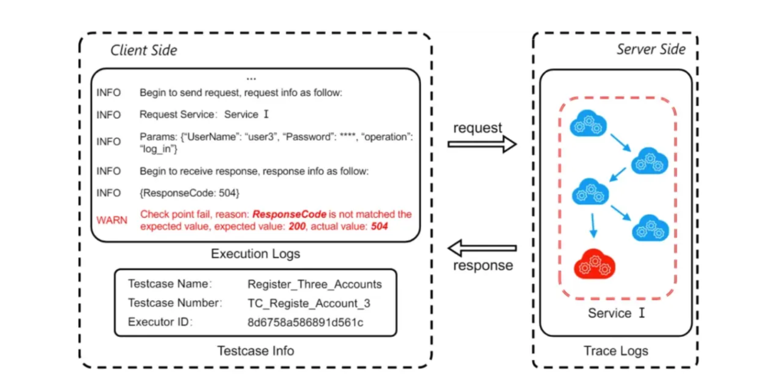 微服务系统中的多源日志在诊断过程中起着关键作用,因为它们提供了有关服务和操作的信息。每个测试用例会生成三种来源的日志,如图1所示:位于用户侧的执行机日志、位于服务器侧的 Trace 日志和测试人员预先编写的测试用例信息。有效地对这三种来源的日志进行联合分析,将能够更加全面有效地对失败测试用例进行建模,并在此基础上实现更加精准的故障诊断。本文的故障诊断包含对失败测试用例进行故障分类和定位,其中故障分类是确定新用例属于哪一个现有的故障类别,而故障定位是识别和突出显示最有可能与根本原因相关的特定日志内容,从而帮助测试人员快速识别和解决故障。