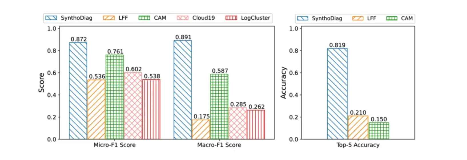 文章将提出的 SynthoDiag 与四种基线方法在华为云某产品数据集上的应用进行比较分析,以评估方法的有效性。图3展示了 SynthoDiag与基线方法在F1分数、Top-5准确率方面的差异。总体来说,SynthoDiag 在所有基线方法中表现最佳,Micro-F1分数为 0.872,Macro-F1分数为0.891。这些分数比最佳基线方法分别高出21%的Micro-F1分数和30%的Macro-F1分数。具体而言,尽管 CAM 的 Micro-F1 分 数为 0.761,其Macro-F1分数为 0.587 较低,其他三个基线方法在 Macro-F1 分数上的表现也较 差,这显示了SynthoDiag在故障分类工作上的优越性。同时,SynthoDiag 在故障定位上也展示出最佳性能,Top-5 准确率为0.819,说明基于模板或基于字符串的定位方法不适合在微服务系统的失败测试用例中定位故障日志内容。