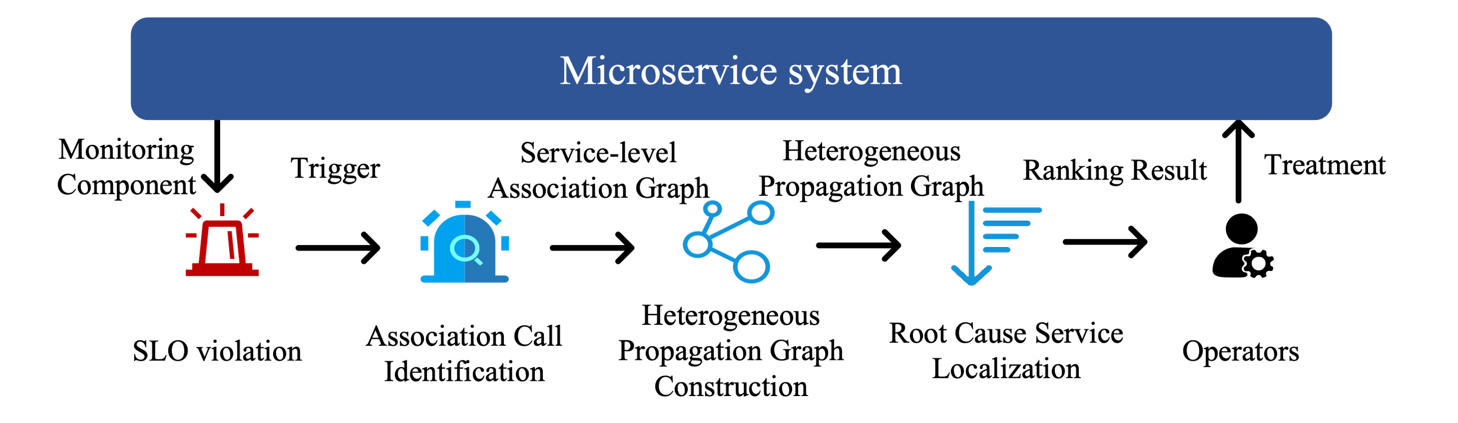 MicroDig的核心框架如图2所示。当微服务系统的监控组件检测到某个服务的运行状态未能达到SLO标准时,MicroDig会被触发以定位问题根因。