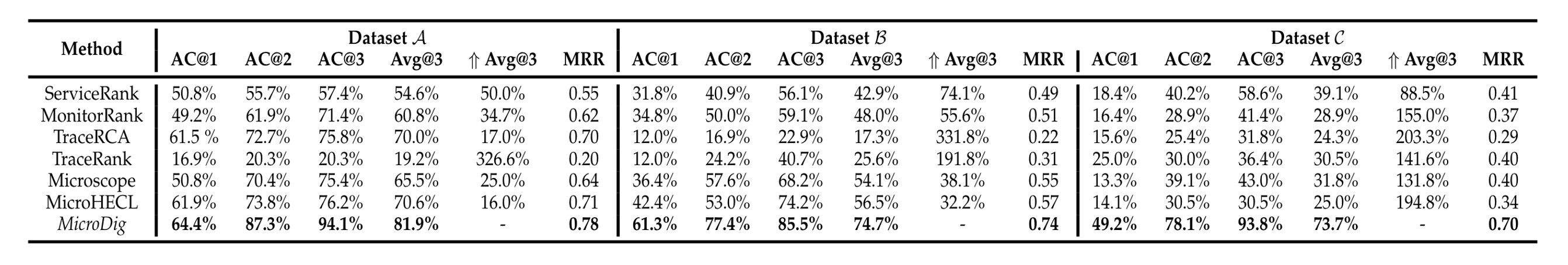 文章在三个数据集上评估了 MicroDig 的性能,这些数据集包括来自腾讯的60个真实性能问题案例、来自广泛使用的开源微服务系统中收集的80个手动注入的问题以及来自一家全球顶级商业银行使用的电子商务系统中的128个性能问题。MicroDig 在这三个数据集上的Top-3准确率分别达到了94.1%、85.5%和93.8%,显著优于六种流行的基准方法。