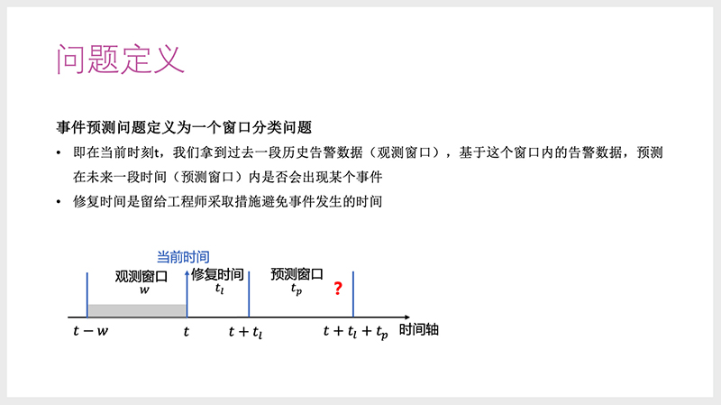 为什么中间有修复时间?这就是故障预测常提到的Leading-Time,留给工程师足够的时间做修复措施,来避免事件的发生。对1分钟后出问题的故障进行预测毫无意义,我们要预测的比如20分钟之后出问题,而这20分钟足够管理员去重启机器,或者做止损措施。我们把它定义成了这样的数学模型。