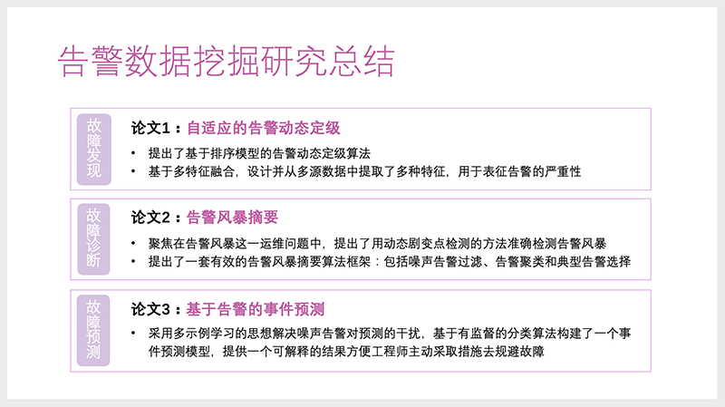 此次我们分享的三篇论文主要是解决故障处置、智能故障分析方向上的痛点。这里再总结下:
