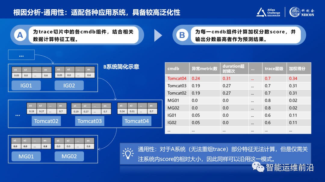 关于通用性,对于A系统无法重组trace,部分特征无法计算。但是, 此方案仅需关注cmdb组件间的相对score比较,因此仍然可以沿用这套方案进行加权评分并找到最大值。因此,这套方案具备较高的通用性,可以通用适配不同数据可用性下的场景。