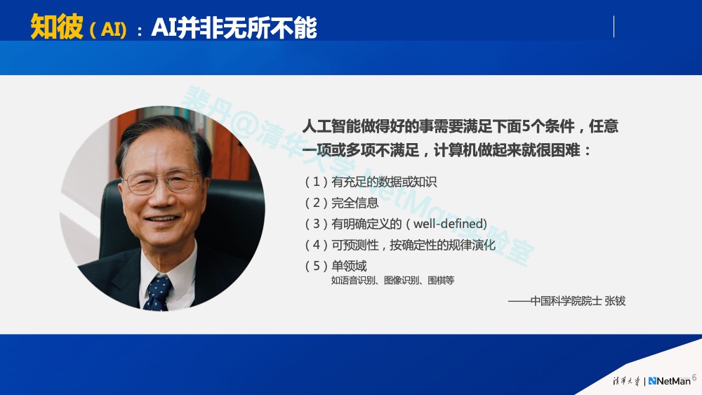 知彼是指我们要充分认识AI作为一种计算机技术类别的演进趋势,并尊重其在一定时间窗口内的能力边界。首先,我们要了解人工智能现在进展到了哪个阶段。引用清华大学计算机系张钹院士的话,“AI并非无所不能,当前AI做得好的事需要同时满足五个条件。”(见下图)