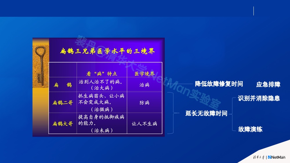 这里类比一下医学里著名的扁鹊三兄弟(下图),对于目前常出故障的一个系统来说, 我们最需要像扁鹊那样治大病的医术,其次需要像扁鹊二哥那样治小病的医术,最后需要像扁鹊大哥那样治未病的医术。具体而言:我们首先要降低故障修复时间,这是规划里最重要、最痛的点;其次,我们要做延长无故障时间,识别并消除那些小隐患;最后,我们还要通过故障演练,即便日常中没有小故障发生,但通过注入故障引出问题,然后解决掉问题,不影响真正的用户。
