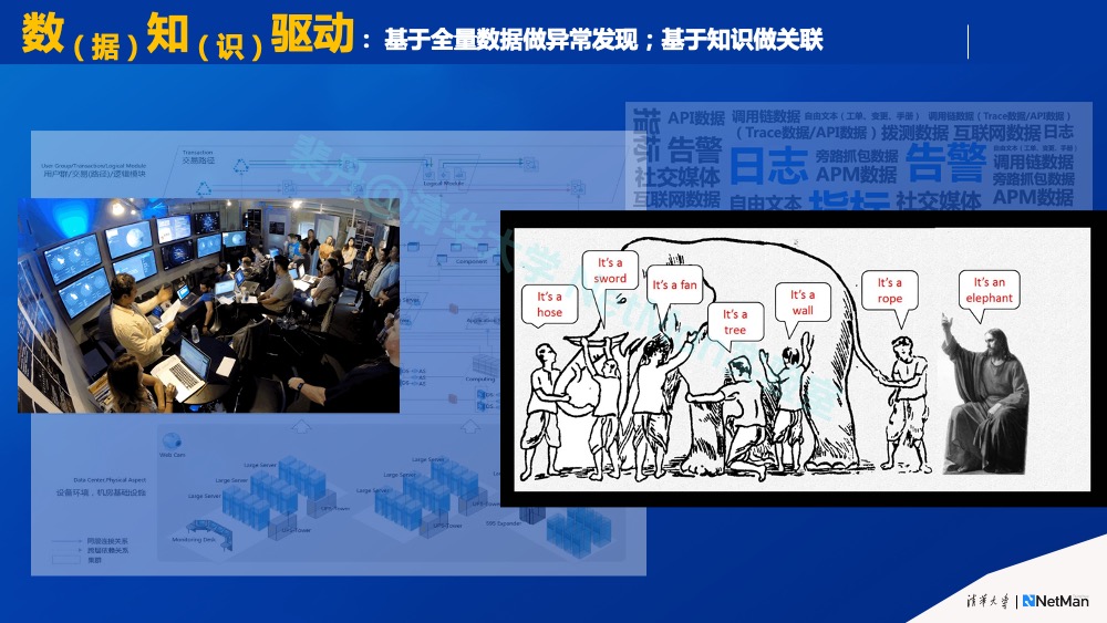 数据和知识双轮驱动的要点在应急排障中的具体体现:一是基于全量数据做异常发现;二是基于知识对一个个零散的异常信号进行关联,从而获得“上帝视角”(如下图)。