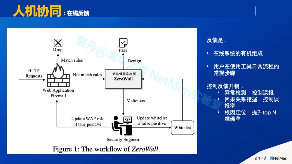 本人认为,上述“无监督算法+主动学习”是一种有前景的方式,属于“人机协同”(如下图中的例子)。我们在 Infocom 2020有一个安全相关的工作,就是human in the loop--- 无监督异常检测+人工在线反馈,能够检测零日攻击。发生零日攻击时,其攻击指纹尚未发现或部署在防火墙中,因此用传统基于指纹的检测方法通常会漏掉零日攻击。无监督方法能够检测出来零日攻击的反常流量,不过不能保证清晰地区分所有攻击和所有新上线的应用的模式,所以我们用线上人工反馈的方式进行反馈。这里要注意的是,这些反馈是该在线系统运行的有机组成,用户在使用工具时的常规步骤(而不是标注离线数据),其使用过程本身就给系统提供了反馈。我们在若干其它工作中也发现把 “人机协同”作为AIOps架构的一部分是行之有效的。