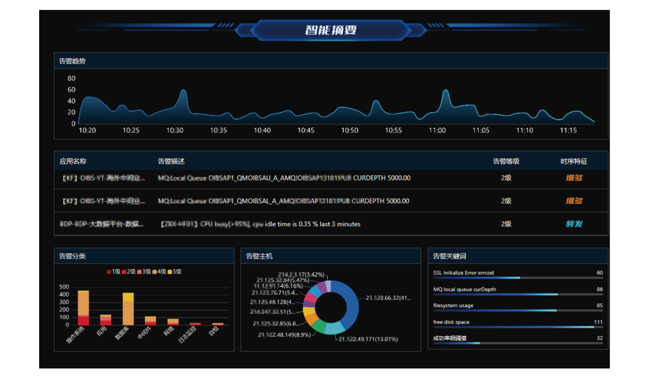 智能应急大屏 发布时间:2023-12-28 17:09:26 通过故事化的场景和直觉化的设计,让应急排障不再困难,通过构建智能摘要大屏、智能推荐大屏和智能告警大屏,让一线人员可以直观且全面的感受和理解数据信息。 告警推荐大屏:通过智能算法提供异常程度最高的Top5业务系统,同时展示每个业务系统中最需要关注的告警描述、告警 等级及时序特征三类关键信息,辅助管理员进行快速故障排查。 智能告警大屏:以时序图的方式清晰展现告警脉络,同时从应用视角展示故障传播情况,辅助管理员快速进行告警追根溯源。 分享到0 上一篇:告警风暴分析 下一篇:拓扑排障