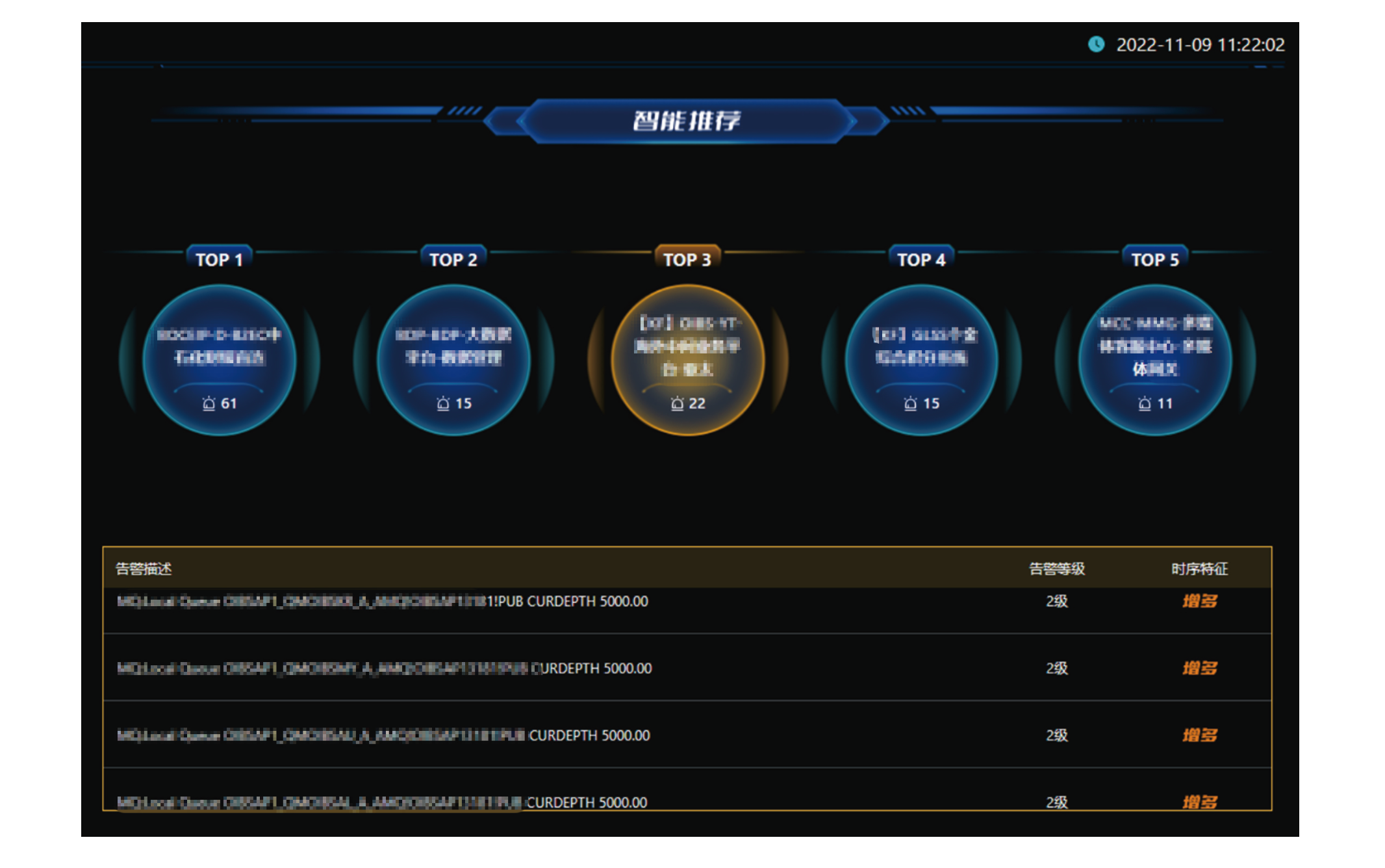 通过故事化的场景和直觉化的设计,让应急排障不再困难,通过构建智能摘要大屏、智能推荐大屏和智能告警大屏,让一线人员可以直观且全面的感受和理解数据信息。 告警推荐大屏:通过智能算法提供异常程度最高的Top5业务系统,同时展示每个业务系统中最需要关注的告警描述、告警 等级及时序特征三类关键信息,辅助管理员进行快速故障排查。 智能告警大屏:以时序图的方式清晰展现告警脉络,同时从应用视角展示故障传播情况,辅助管理员快速进行告警追根溯源。